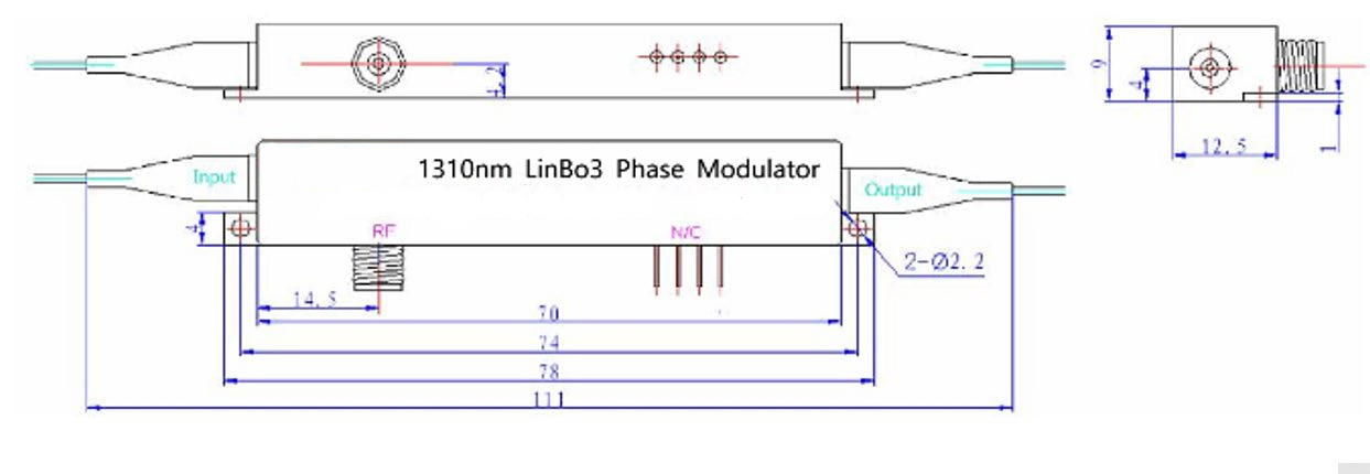 The 1310/1550nm lithium niobate (LiNbO3) high frequency phase modulator uses titanium diffusion or proton exchange technology to make optical waveguides. The input and output optical fibers are precisely obliquely coupled to the waveguides, and the electro-optical effect of lithium niobate materials is used to achieve phase modulation of optical signals. Titanium diffusion (Ti-indiffusion) or proton exchange (APE) waveguide technology can obtain birefringence or single polarization phase modulation respectively.